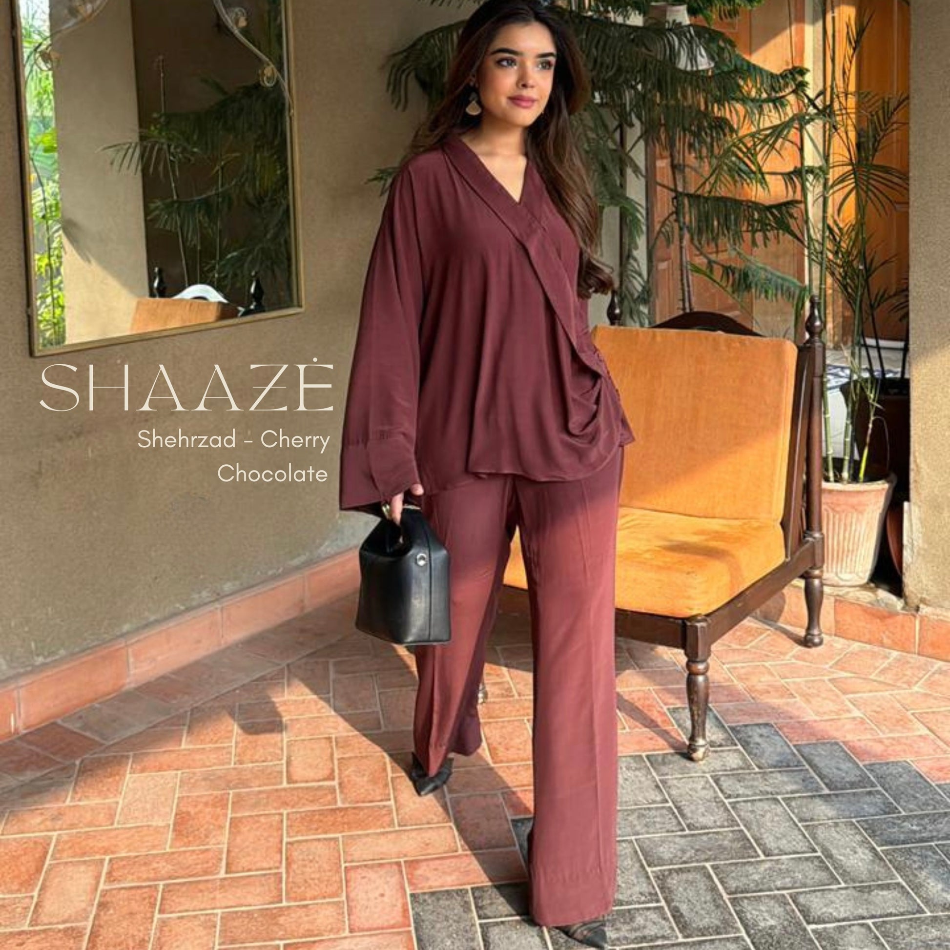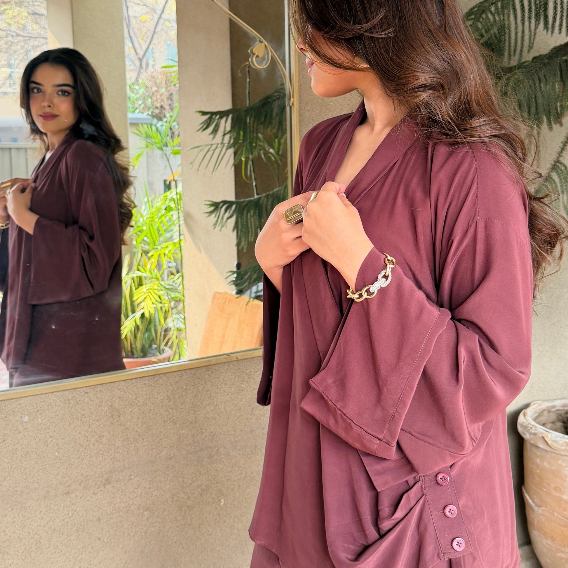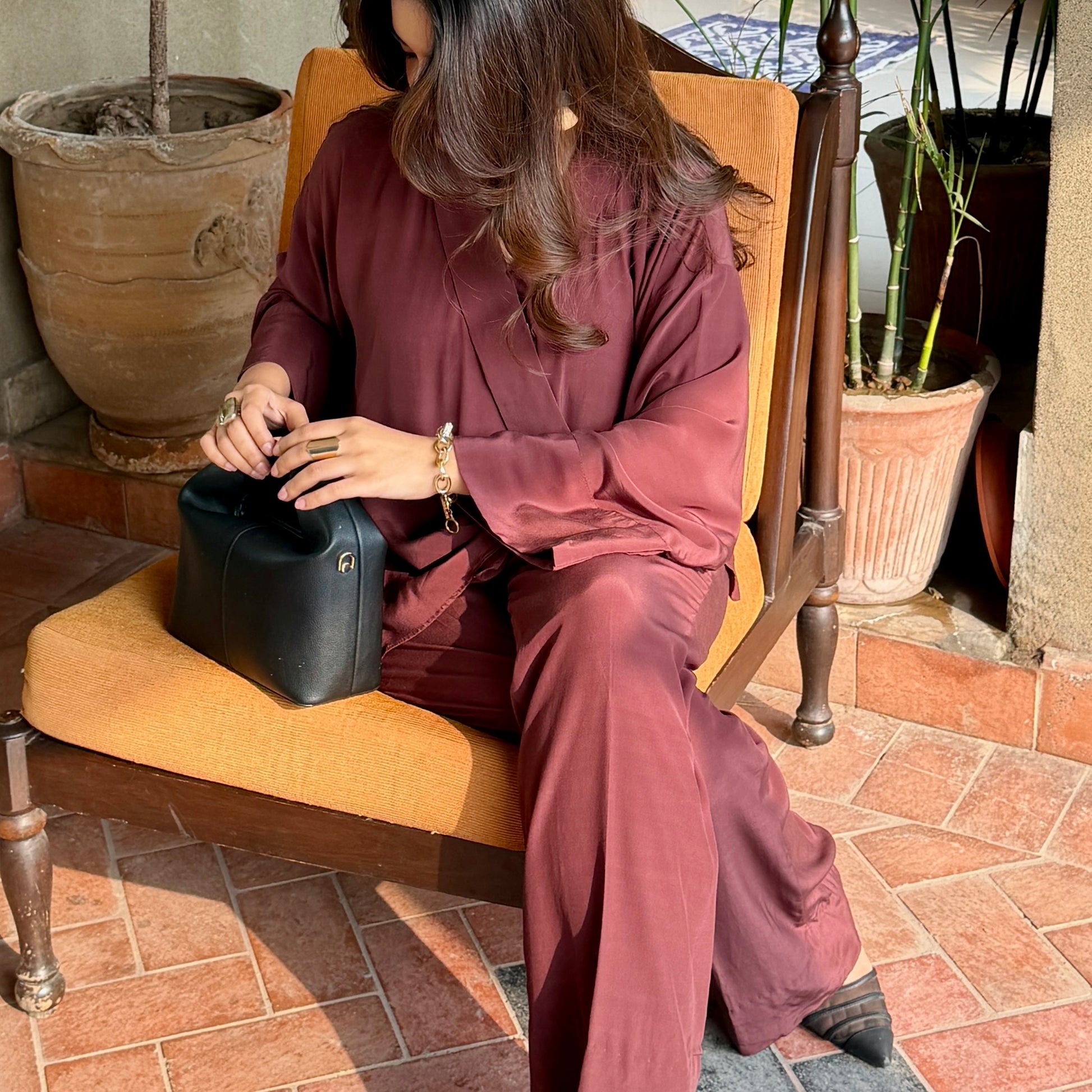 A modern cut co-ord set with long trousers and a jacket. Perfect as smart casual or semi formal. The fall of the fabric gives a flattering fit.