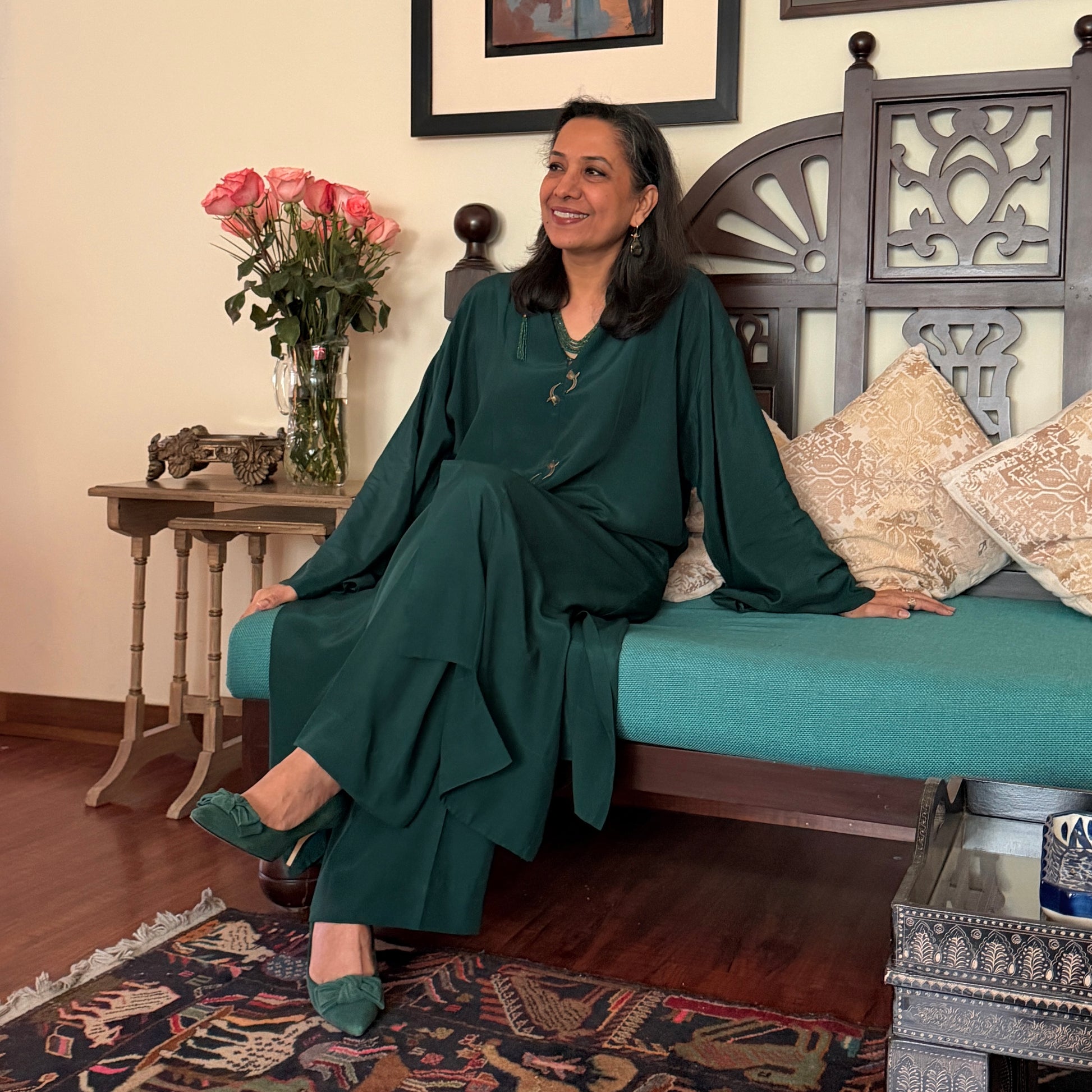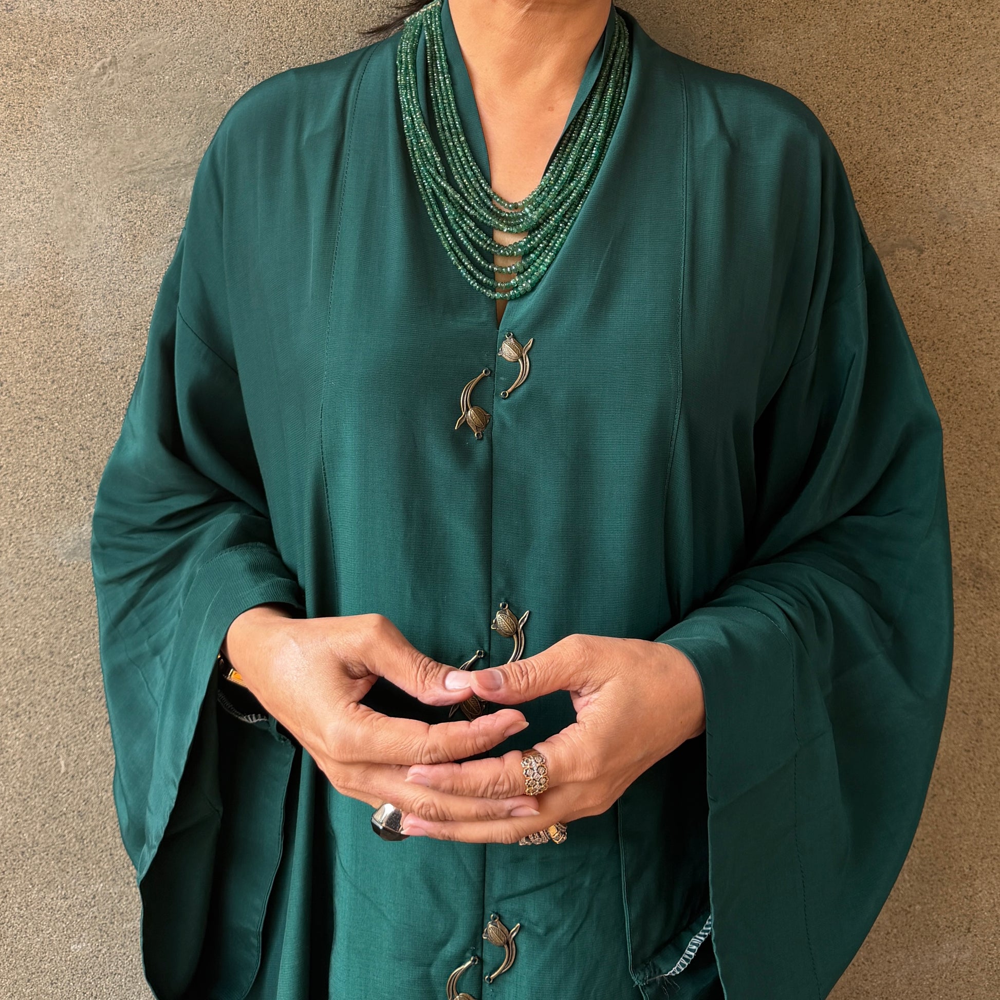 A sophisticated, clean cut two piece outfit. A long flowing, front open shirt with wide legged trousers. Perfect evening wear outfit that can be instantly turned into a formal dress.