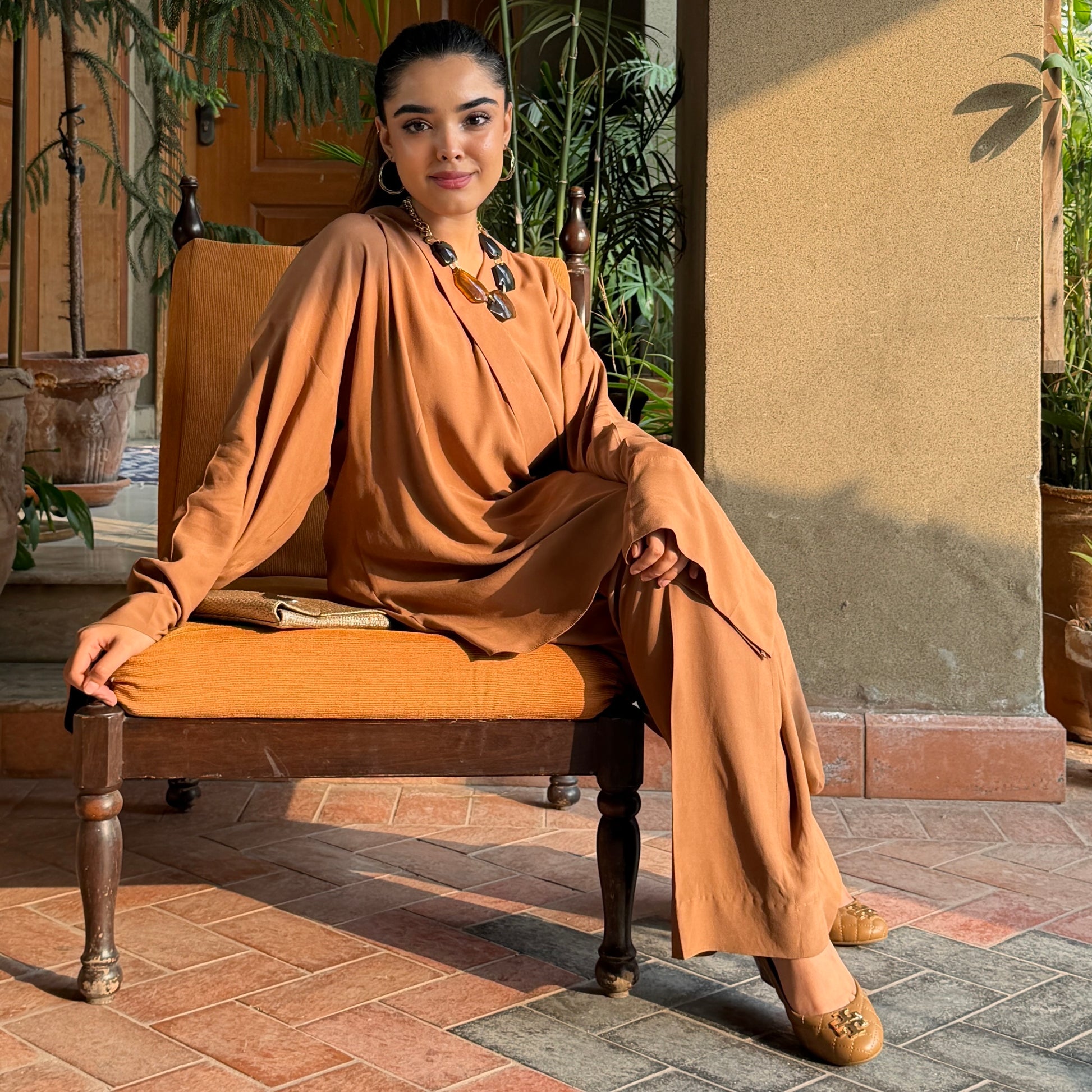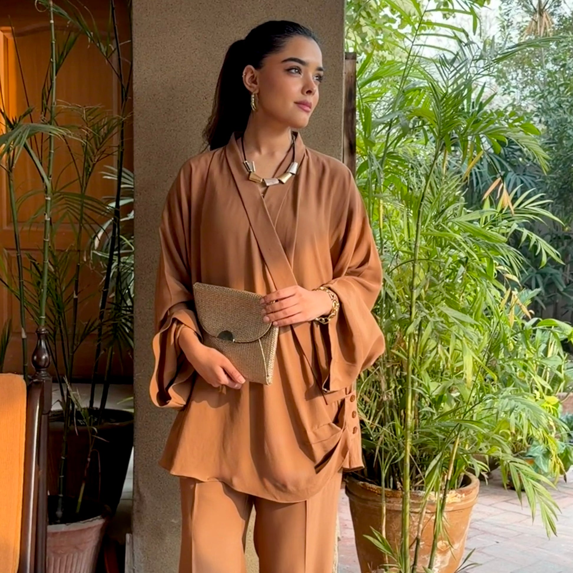 A modern cut co-ord set with long trousers and a jacket. Perfect as smart casual or semi formal. The fall of the fabric gives a flattering fit.